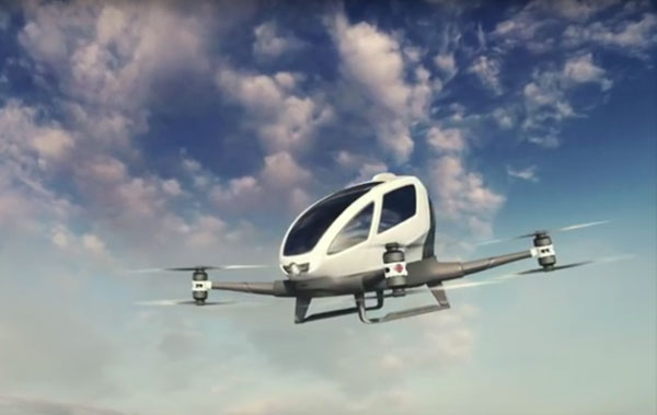 Det kinesiska företaget Ehang har skapat drönaren Ehang 184. En drönare är en radiostyrd mindre helikopter.