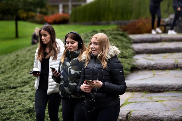 I små grupper promenerar de omkring och lyssnar på boken, elever från Nobelgymnasiets barn- och ungdomsprogram och blivande frisörer som går hantverksprogrammet.
