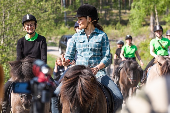 Självklart fick Victoria posera framför kamerorna innan vandringen började. Men då passade hennes häst Omi på att kissa en rejäl skvätt. Kronprinsessan fick hoppa undan för att klara sig oskadd.