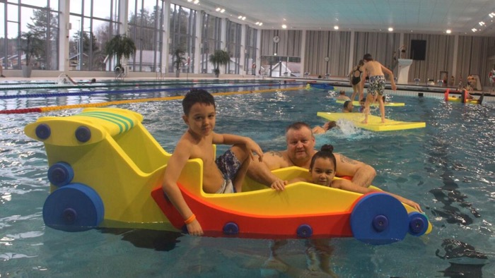 Stefan Olsson som tagit med sig barnen Kevin och Tindra för att leka i bassängen.