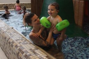 Lille Harry Wedberg från Årjäng har följt med mamma Moa samt morfar och mormor från Fengersfors till Säffle för att bada i barnbassängen